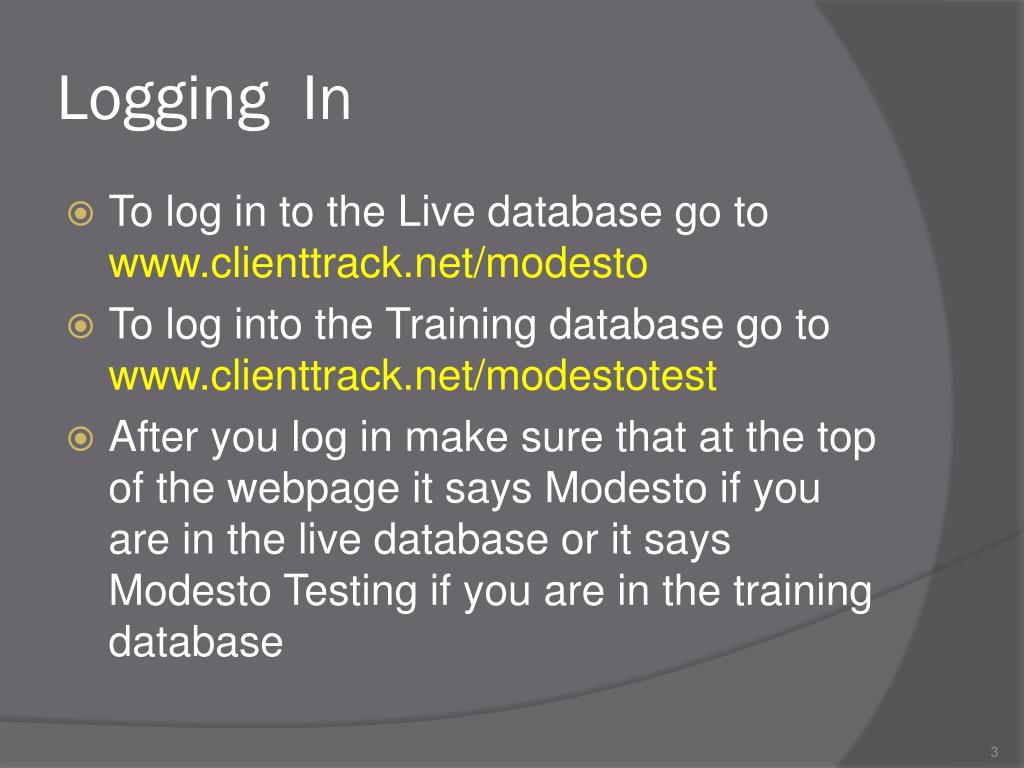 Logging in Production Database www.clienttrack.net/modesto Testing Database www.clienttrack.net/modestotest