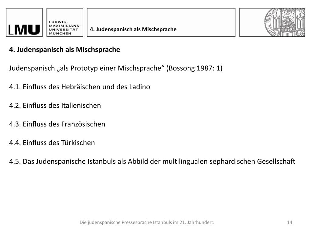 4. Judenspanisch als Mischsprache • 4. Judenspanisch als Mischsprache • Judenspanisch „als Prototyp einer Mischsprache“ (Bossong 1987: 1) • 4.1. Einfluss des Hebräischen und des Ladino • 4.2. Einfluss des Italienischen • 4.3. Einfluss des Französischen • 4.4. Einfluss des Türkischen • 4.5. Das Judenspanische Istanbuls als Abbild der multilingualen sephardischen Gesellschaft Die judenspanische Pressesprache Istanbuls im 21. Jahrhundert.