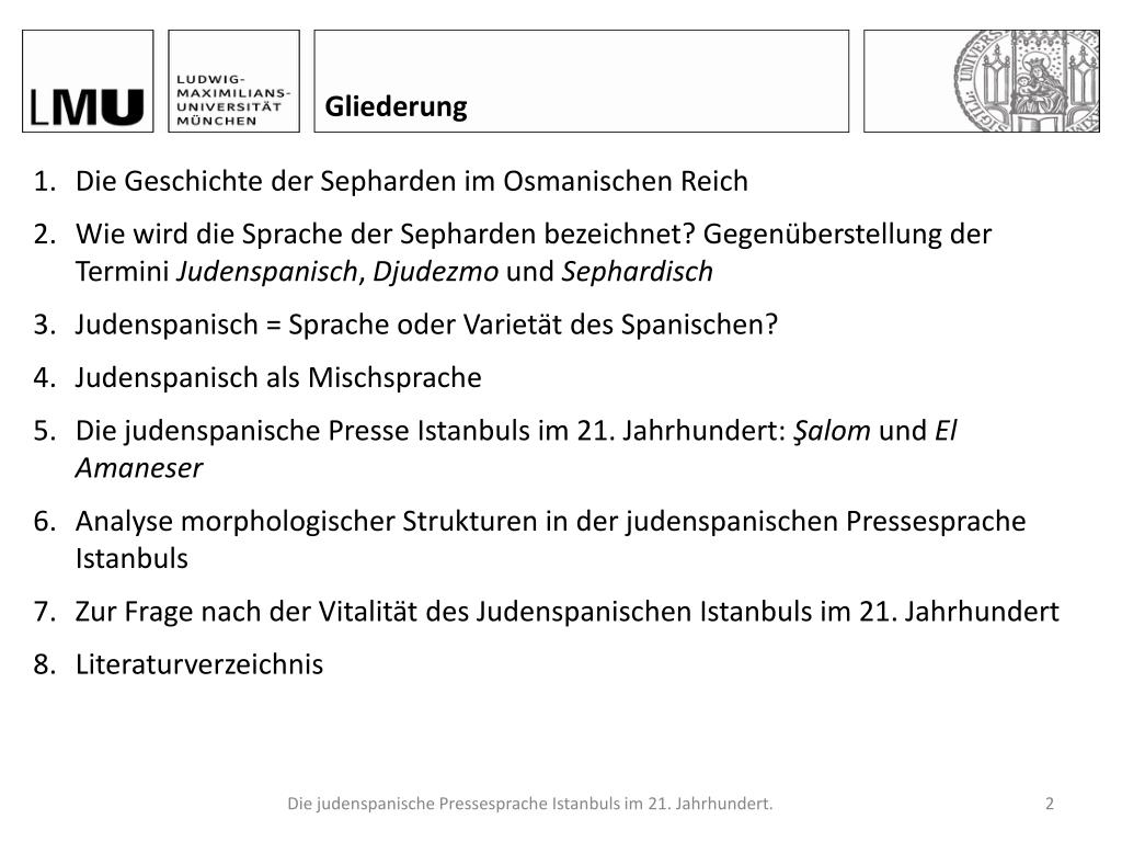 Zwischen Tradition und Moderne. Die judenspanische Pressesprache Istanbuls im 21. Jahrhundert am Beispiel der sephardischen Zeitungen Şalom und El Amaneser . Carolina Spiegel Institut für Romanische Philologie Ludwig-Maximilians-Universität München. Gliederung.