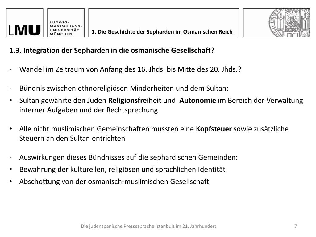 1. Die Geschichte der Sepharden im Osmanischen Reich 1. Die Geschichte der Sepharden im Osmanischen Reich 1.1. Diaspora als Folge von der Vertreibung von der Iberischen Halbinsel 1.2. Das Osmanische Reich als neue Heimat der Sepharden 1.3. Integration der Sepharden in die osmanische Gesellschaft? 1.4. Einfluss der Alliance Israélite Universelle im Zeitraum von 1860 – 1923 1.5. Politische und gesellschaftliche Folgen der Gründung der Republik Türkei 1.6. Die sephardischen Gemeinden in der Türkei im 21. Jahrhundert Die judenspanische Pressesprache Istanbuls im 21. Jahrhundert.