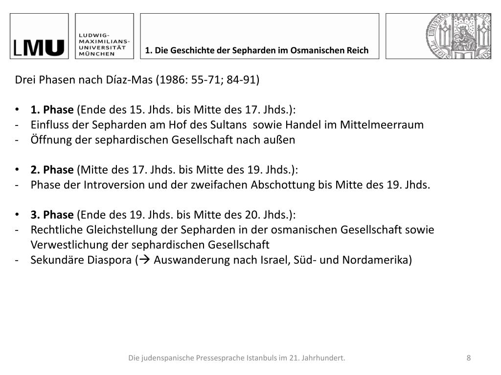 1. Die Geschichte der Sepharden im Osmanischen Reich Bossong (2008: 129) Die judenspanische Pressesprache Istanbuls im 21. Jahrhundert.
