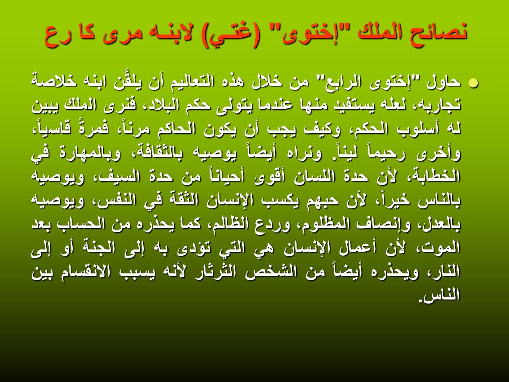 نصائح الملك "إختوى" (غتـي) لابنـه مرى كا رع • حاول "إختوى الرابع" من خلال هذه التعاليم أن يلقَّن ابنه خلاصة تجاربه، لعله يستفيد منها عندما يتولى حكم البلاد، فنرى الملك يبين له أسلوب الحكم، وكيف يجب أن يكون الحاكم مرناً، فمرةً قاسياً، وأخرى رحيماً ليناً. ونراه أيضاً يوصيه بالثقافة، وبالمهارة في الخطابة، لأن حدة اللسان أقوى أحياناً من حدة السيف، ويوصيه بالناس خيراً، لأن حبهم يكسب الإنسان الثقة في النفس، ويوصيه بالعدل، وإنصاف المظلوم، وردع الظالم، كما يحذره من الحساب بعد الموت، لأن أعمال الإنسان هي التي تؤدى به إلى الجنة أو إلى النار، ويحذره أيضاً من الشخص الثرثار لأنه يسبب الانقسام بين الناس.