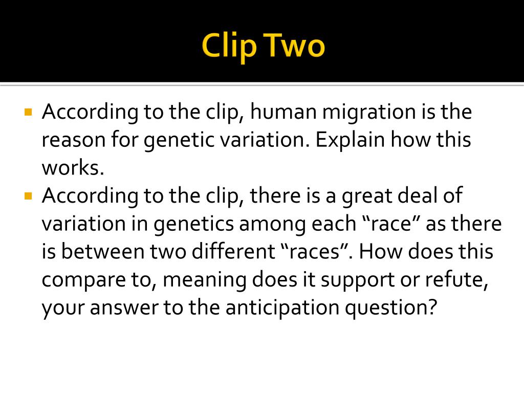 Clip Two • According to the clip, human migration is the reason for genetic variation. Explain how this works. • According to the clip, there is a great deal of variation in genetics among each “race” as there is between two different “races”. How does this compare to, meaning does it support or refute, your answer to the anticipation question?