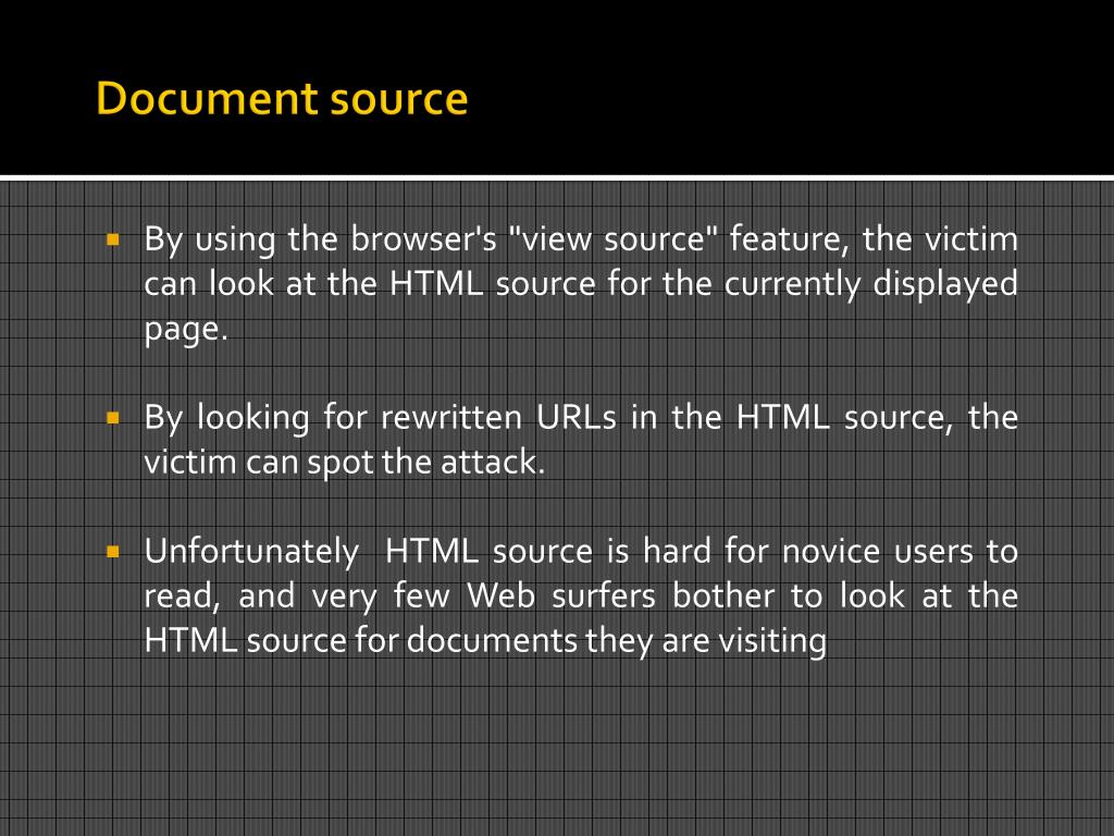 Document source • By using the browser's "view source" feature, the victim can look at the HTML source for the currently displayed page. • By looking for rewritten URLs in the HTML source, the victim can spot the attack. • Unfortunately HTML source is hard for novice users to read, and very few Web surfers bother to look at the HTML source for documents they are visiting