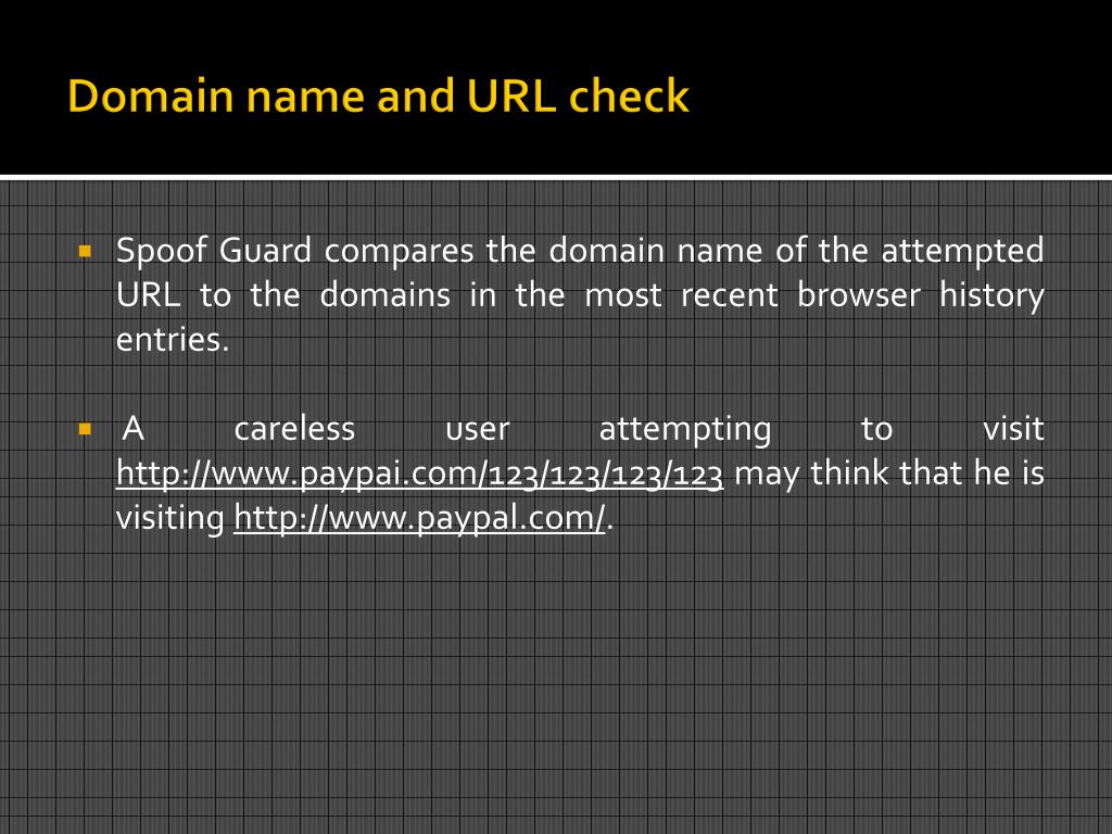 Domain name and URL check • Spoof Guard compares the domain name of the attempted URLto the domains in the most recent browser history entries. • A careless user attempting to visit http://www.paypai.com/123/123/123/123may think that he is visiting http://www.paypal.com/.
