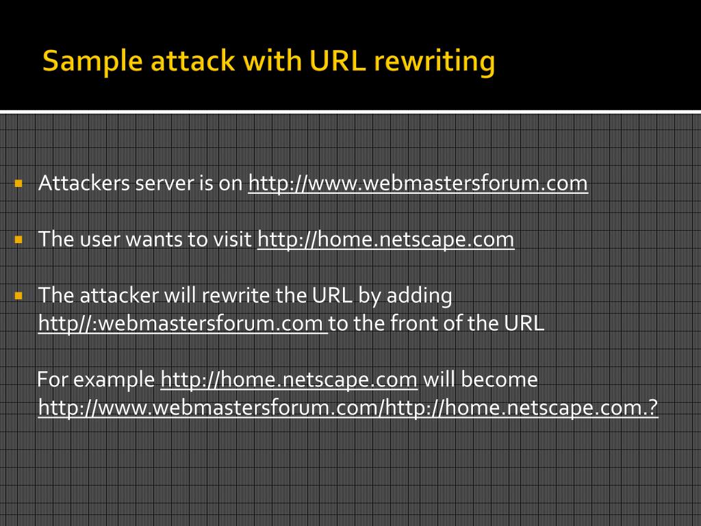 Sample attack with URL rewriting • Attackers server is on http://www.webmastersforum.com • The user wants to visit http://home.netscape.com • The attacker will rewrite the URL by adding http//:webmastersforum.com to the front of the URL For example http://home.netscape.com will become http://www.webmastersforum.com/http://home.netscape.com.?