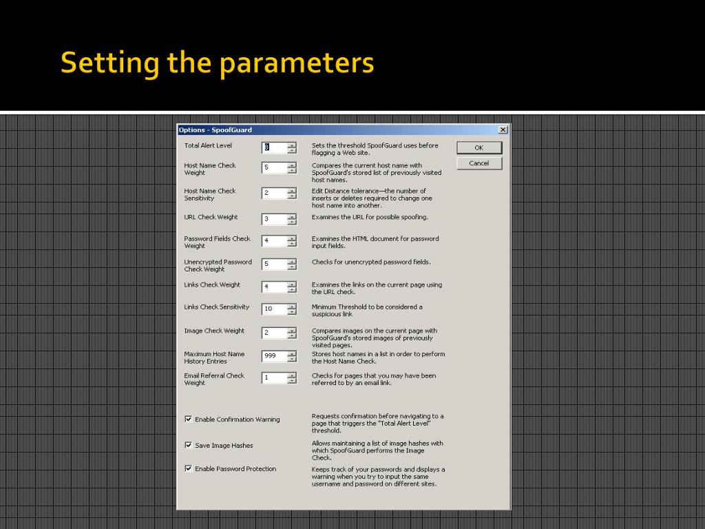 Spoof Guard • Spoof Guard is a tool to help prevent a form of malicious attack called "web spoofing" or "phishing." • Spoof Guard is a browser plug in that is compatible with Microsoft Internet Explorer • Spoof Guard places a traffic light in the browser toolbar that turns from green to yellow to red as the user navigate to a spoof site. • If the user try to enter sensitive information into a form from a spoof site, Spoof Guard will save the data and warn the user.
