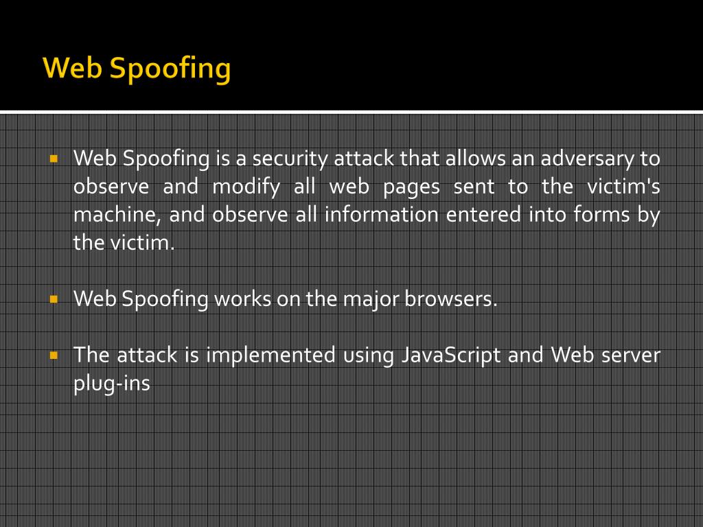 Web Spoofing • Web Spoofing is a security attack that allows an adversary to observe and modify all web pages sent to the victim's machine, and observe all information entered into forms by the victim. • Web Spoofing works on the major browsers. • The attack is implemented using JavaScript and Web server plug-ins