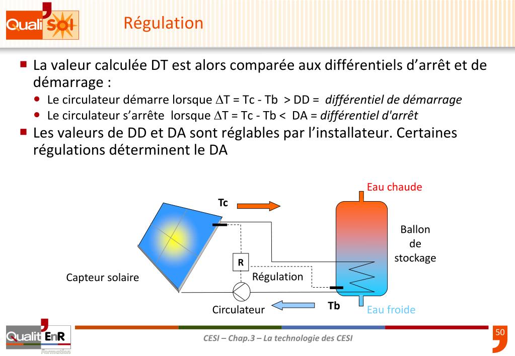 La valeur calculée DT est alors comparée aux différentiels d’arrêt et de démarrage : Le circulateur démarre lorsque T = Tc - Tb > DD = différentiel de démarrage Le circulateur s’arrête lorsque T = Tc - Tb < DA = différentiel d'arrêt Les valeurs de DD et DA sont réglables par l’installateur. Certaines régulations déterminent le DA Régulation Eau chaude Tc Ballon de stockage R Régulation Capteur solaire Tb Circulateur Eau froide