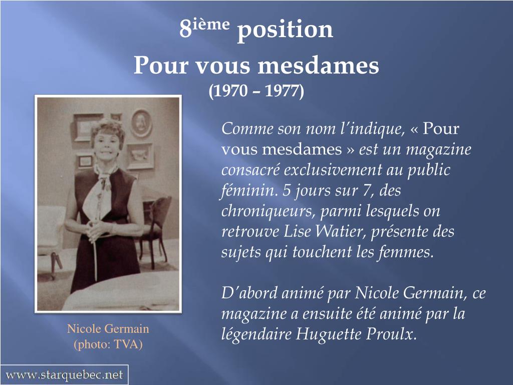 8ième position Pour vous mesdames (1970 – 1977) Comme son nom l’indique, « Pour vous mesdames » est un magazine consacré exclusivement au public féminin. 5 jours sur 7, des chroniqueurs, parmi lesquels on retrouve Lise Watier, présente des sujets qui touchent les femmes. D’abord animé par Nicole Germain, ce magazine a ensuite été animé par la légendaire Huguette Proulx. Nicole Germain (photo: TVA)