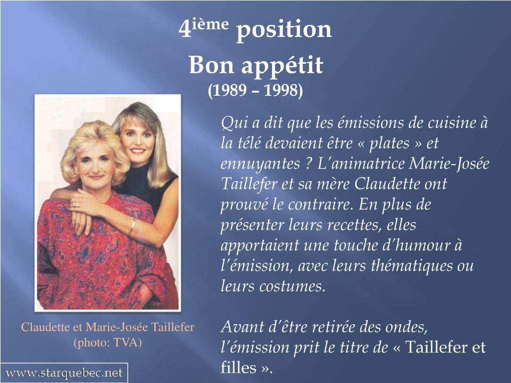 4ième position Bon appétit (1989 – 1998) Qui a dit que les émissions de cuisine à la télé devaient être « plates » et ennuyantes ? L’animatrice Marie-Josée Taillefer et sa mère Claudette ont prouvé le contraire. En plus de présenter leurs recettes, elles apportaient une touche d’humour à l’émission, avec leurs thématiques ou leurs costumes. Avant d’être retirée des ondes, l’émission prit le titre de « Taillefer et filles ». Claudette et Marie-Josée Taillefer (photo: TVA)