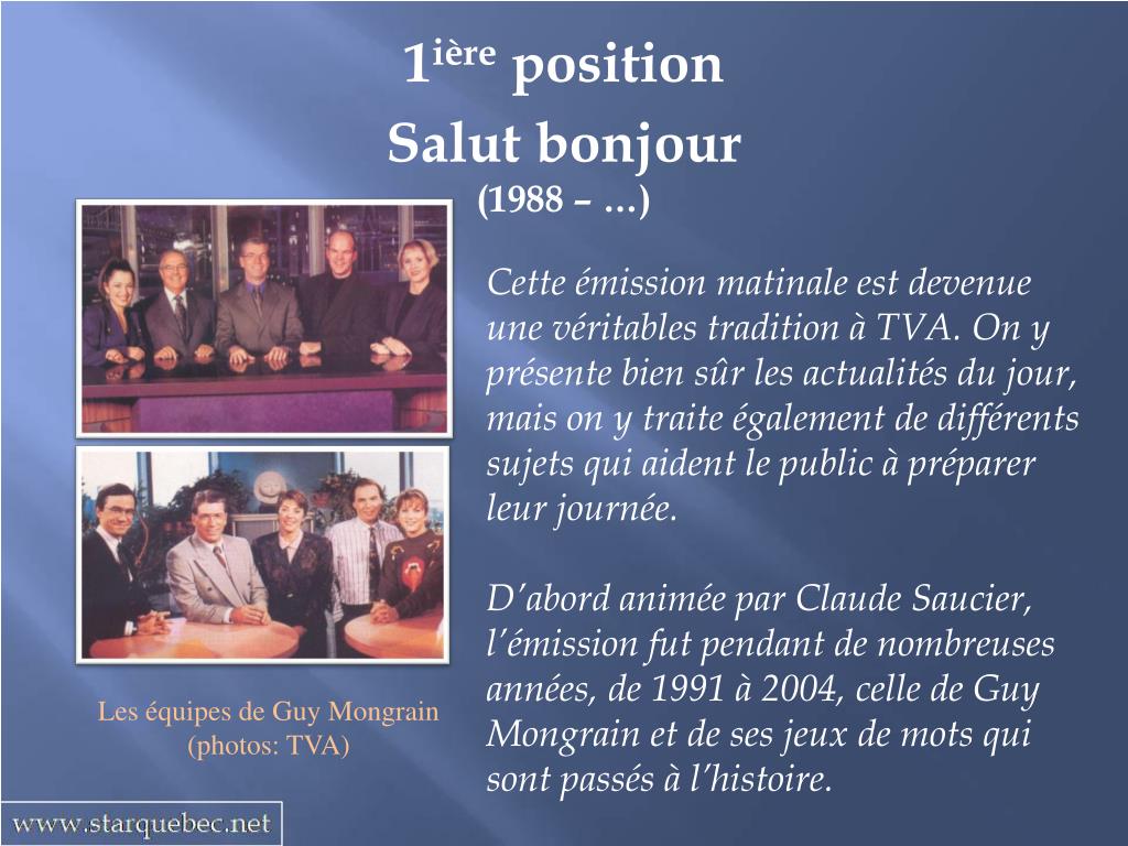 1ière position Salut bonjour (1988 – …) Cette émission matinale est devenue une véritables tradition à TVA. On y présente bien sûr les actualités du jour, mais on y traite également de différents sujets qui aident le public à préparer leur journée. D’abord animée par Claude Saucier, l’émission fut pendant de nombreuses années, de 1991 à 2004, celle de Guy Mongrain et de ses jeux de mots qui sont passés à l’histoire. Les équipes de Guy Mongrain (photos: TVA)
