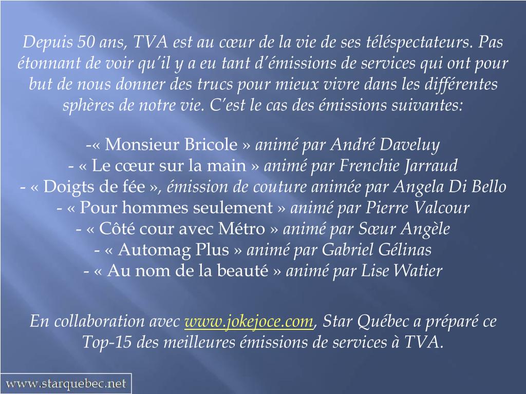 Depuis 50 ans, TVA est au cœur de la vie de ses téléspectateurs. Pas étonnant de voir qu’il y a eu tant d’émissions de services qui ont pour but de nous donner des trucs pour mieux vivre dans les différentes sphères de notre vie. C’est le cas des émissions suivantes: • « Monsieur Bricole » animé par André Daveluy • « Le cœur sur la main » animé par Frenchie Jarraud • « Doigts de fée », émission de couture animée par Angela Di Bello • « Pour hommes seulement » animé par Pierre Valcour • « Côté cour avec Métro » animé par Sœur Angèle • « Automag Plus » animé par Gabriel Gélinas • « Au nom de la beauté » animé par Lise Watier En collaboration avec www.jokejoce.com, Star Québec a préparé ce Top-15 des meilleures émissions de services à TVA.