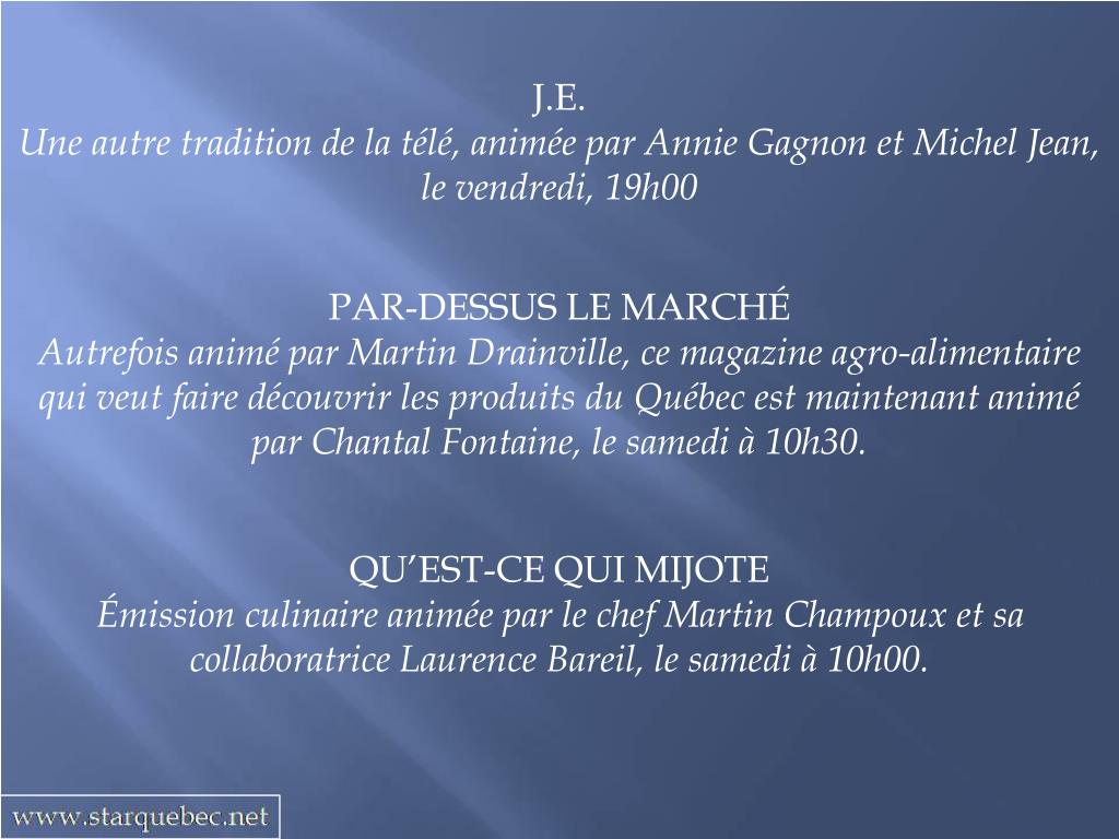 J.E. Une autre tradition de la télé, animée par Annie Gagnon et Michel Jean, le vendredi, 19h00 PAR-DESSUS LE MARCHÉ Autrefois animé par Martin Drainville, ce magazine agro-alimentaire qui veut faire découvrir les produits du Québec est maintenant animé par Chantal Fontaine, le samedi à 10h30. QU’EST-CE QUI MIJOTE Émission culinaire animée par le chef Martin Champoux et sa collaboratrice Laurence Bareil, le samedi à 10h00.
