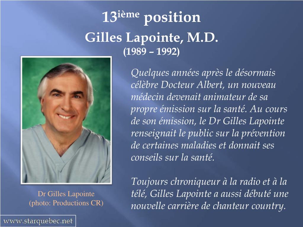 13ième position Gilles Lapointe, M.D. (1989 – 1992) Quelques années après le désormais célèbre Docteur Albert, un nouveau médecin devenait animateur de sa propre émission sur la santé. Au cours de son émission, le Dr Gilles Lapointe renseignait le public sur la prévention de certaines maladies et donnait ses conseils sur la santé. Toujours chroniqueur à la radio et à la télé, Gilles Lapointe a aussi débuté une nouvelle carrière de chanteur country. Dr Gilles Lapointe (photo: Productions CR)
