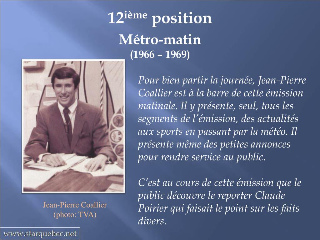 12ième position Métro-matin (1966 – 1969) Pour bien partir la journée, Jean-Pierre Coallier est à la barre de cette émission matinale. Il y présente, seul, tous les segments de l’émission, des actualités aux sports en passant par la météo. Il présente même des petites annonces pour rendre service au public. C’est au cours de cette émission que le public découvre le reporter Claude Poirier qui faisait le point sur les faits divers. Jean-Pierre Coallier (photo: TVA)