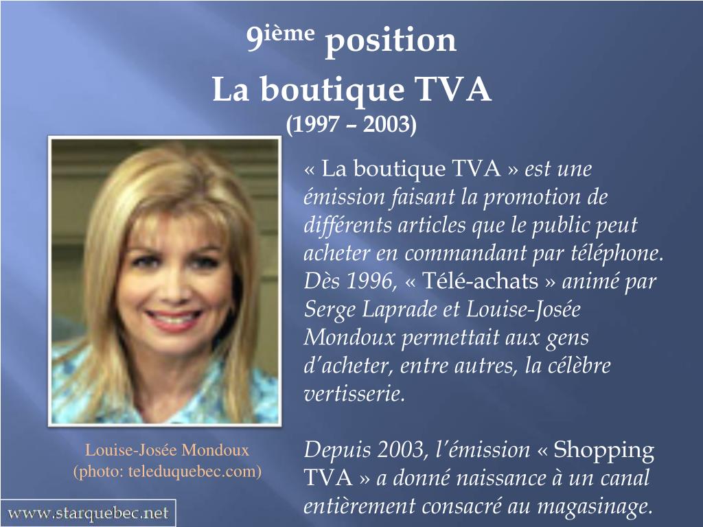 9ième position La boutique TVA (1997 – 2003) « La boutique TVA » est une émission faisant la promotion de différents articles que le public peut acheter en commandant par téléphone. Dès 1996, « Télé-achats » animé par Serge Laprade et Louise-Josée Mondoux permettait aux gens d’acheter, entre autres, la célèbre vertisserie. Depuis 2003, l’émission « Shopping TVA » a donné naissance à un canal entièrement consacré au magasinage. Louise-Josée Mondoux (photo: teleduquebec.com)
