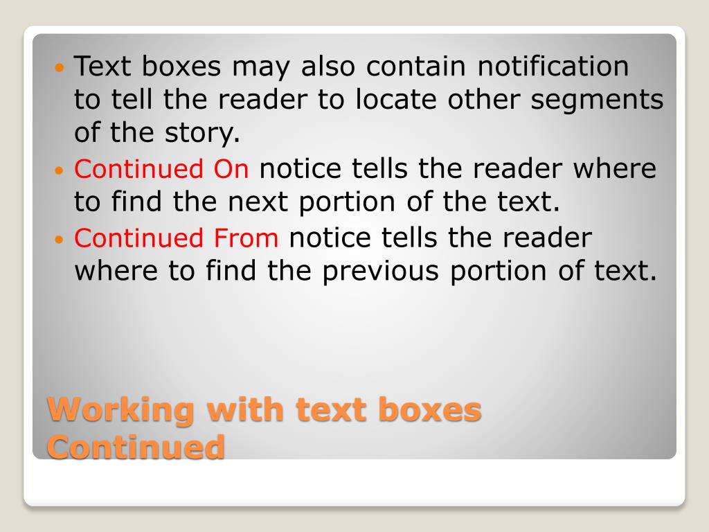Text boxes may also contain notification to tell the reader to locate other segments of the story. • Continued On notice tells the reader where to find the next portion of the text. • Continued From notice tells the reader where to find the previous portion of text. Working with text boxes Continued