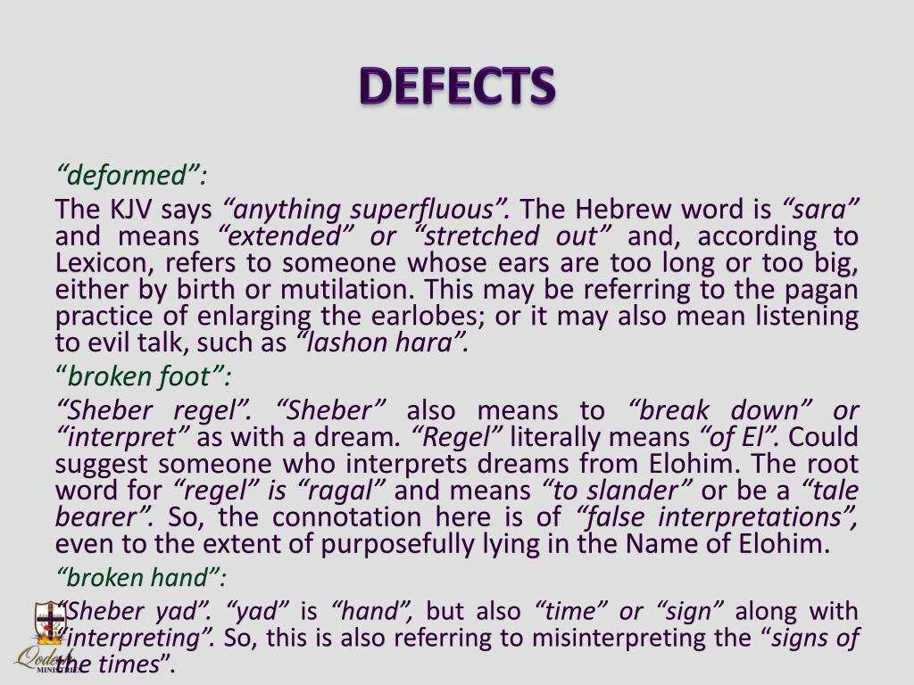DEFECTS “deformed”: The KJV says “anything superfluous”. The Hebrew word is “sara” and means “extended” or “stretched out” and, according to Lexicon, refers to someone whose ears are too long or too big, either by birth or mutilation. This may be referring to the pagan practice of enlarging the earlobes; or it may also mean listening to evil talk, such as “lashonhara”. “broken foot”: “Sheberregel”. “Sheber” also means to “break down” or “interpret” as with a dream. “Regel” literally means “of El”. Could suggest someone who interprets dreams from Elohim. The root word for “regel” is “ragal” and means “to slander” or be a “tale bearer”. So, the connotation here is of “false interpretations”, even to the extent of purposefully lying in the Name of Elohim. “broken hand”: “Sheberyad”. “yad” is “hand”, but also “time” or “sign” along with “interpreting”. So, this is also referring to misinterpreting the “signs of the times”.