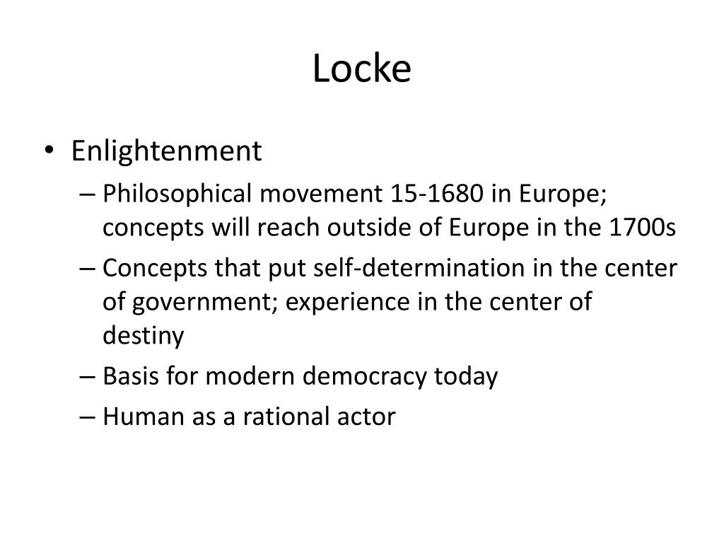 Locke • Enlightenment • Philosophical movement 15-1680 in Europe; concepts will reach outside of Europe in the 1700s • Concepts that put self-determination in the center of government; experience in the center of destiny • Basis for modern democracy today • Human as a rational actor