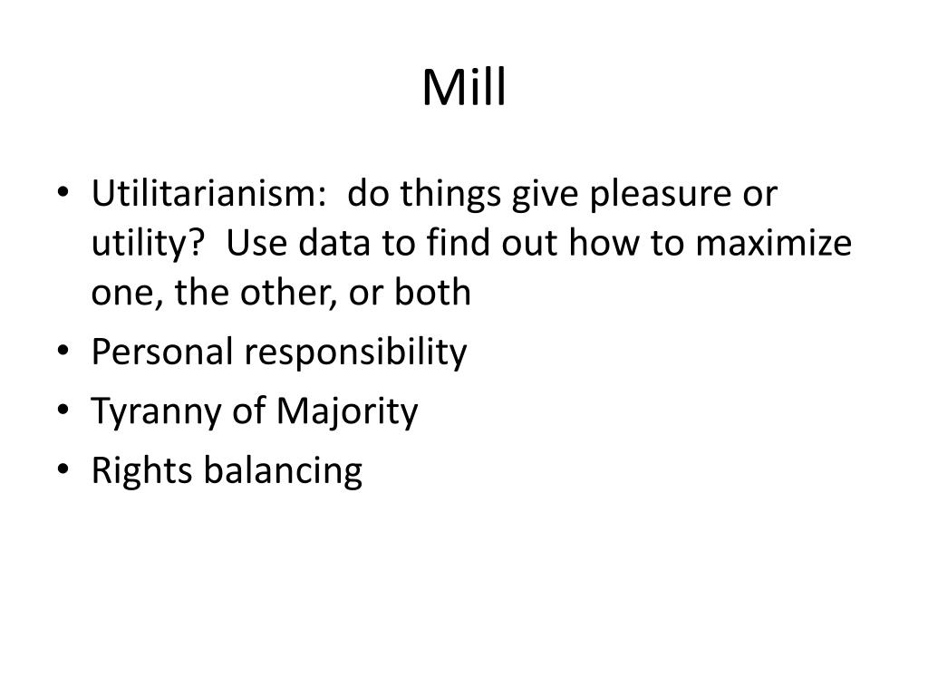 Mill • Utilitarianism: do things give pleasure or utility? Use data to find out how to maximize one, the other, or both • Personal responsibility • Tyranny of Majority • Rights balancing