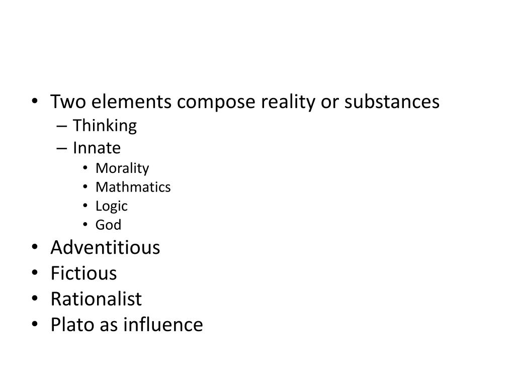 Two elements compose reality or substances • Thinking • Innate • Morality • Mathmatics • Logic • God • Adventitious • Fictious • Rationalist • Plato as influence