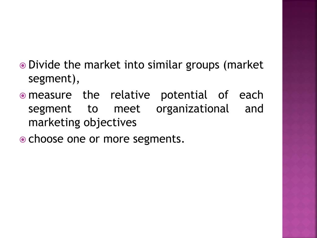 Divide the market into similar groups (market segment), • measure the relative potential of each segment to meet organizational and marketing objectives • choose one or more segments.
