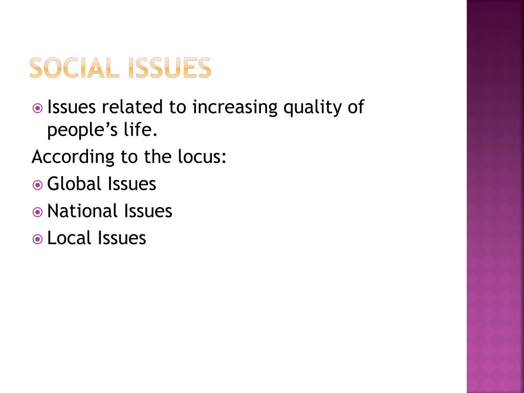 Social Issues • Issues related to increasing quality of people’s life. According to the locus: • Global Issues • National Issues • Local Issues