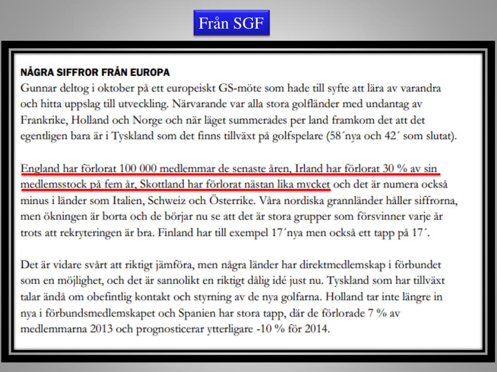 I år (och två år framåt) har vi marknadsfört oss via Visit-Sweden och SGF, för att synas mer i Danmark och Norge. Norge ligger inte särskilt bra för att locka norska golfare till Värnamo. 13 golfare från 9 norska klubbar har uppskattat vyer och en bana av hög kvalitet. Danska golfare har i flera år besökt oss. 157 greenfees har betalats av gästande danska golfare från 43 danska golfklubba (av Danmarks 181 klubbar).