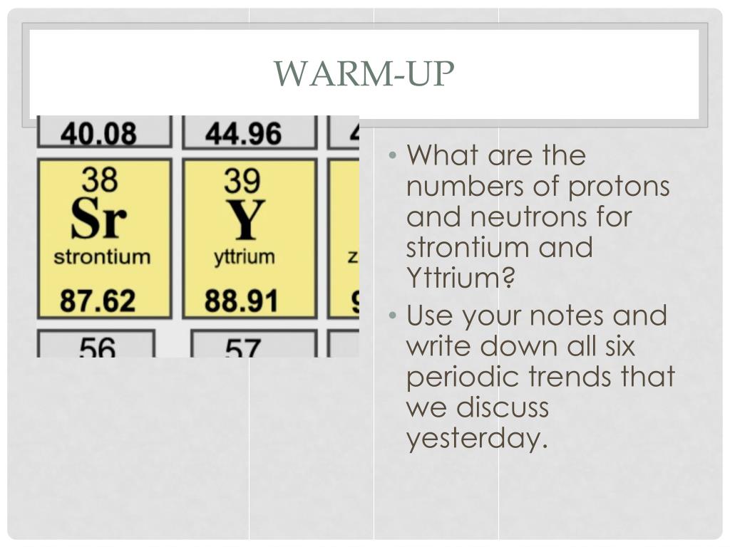 Warm-up • What are the numbers of protons and neutrons for strontium and Yttrium?Useyour notes and write down all six periodic trends that we discuss yesterday.