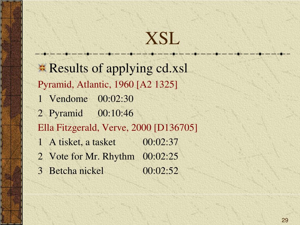 XSL • Results of applying cd.xsl Pyramid, Atlantic, 1960 [A2 1325] 1 Vendome 00:02:30 2 Pyramid 00:10:46 Ella Fitzgerald, Verve, 2000 [D136705] 1 A tisket, a tasket 00:02:37 2 Vote for Mr. Rhythm 00:02:25 3 Betcha nickel 00:02:52