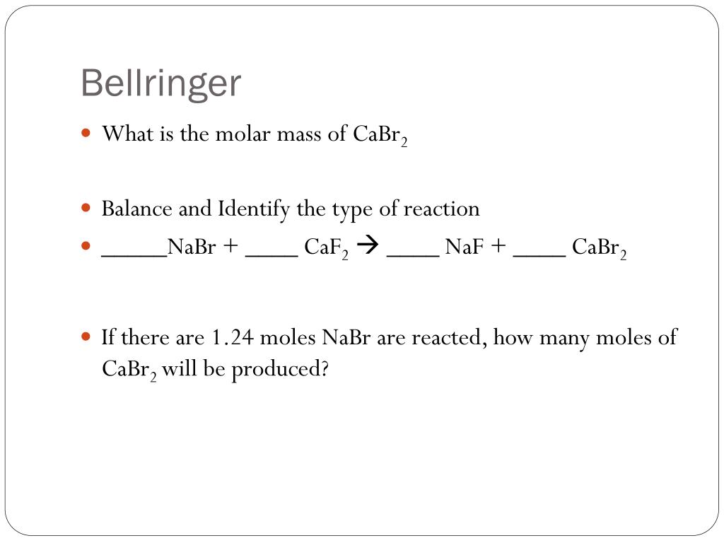 Bellringer • What is the molar mass of CaBr2 • Balance and Identify the type of reaction • _____NaBr + ____ CaF2 ____ NaF + ____ CaBr2 • If there are 1.24 moles NaBr are reacted, how many moles of CaBr2 will be produced?