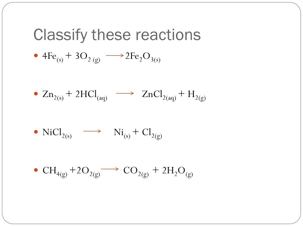 Classify these reactions • 4Fe(s) + 3O2 (g) 2Fe2O3(s) • Zn2(s) + 2HCl(aq) ZnCl2(aq) + H2(g) • NiCl2(s) Ni(s) + Cl2(g) • CH4(g) +2O2(g) CO2(g) + 2H2O(g)
