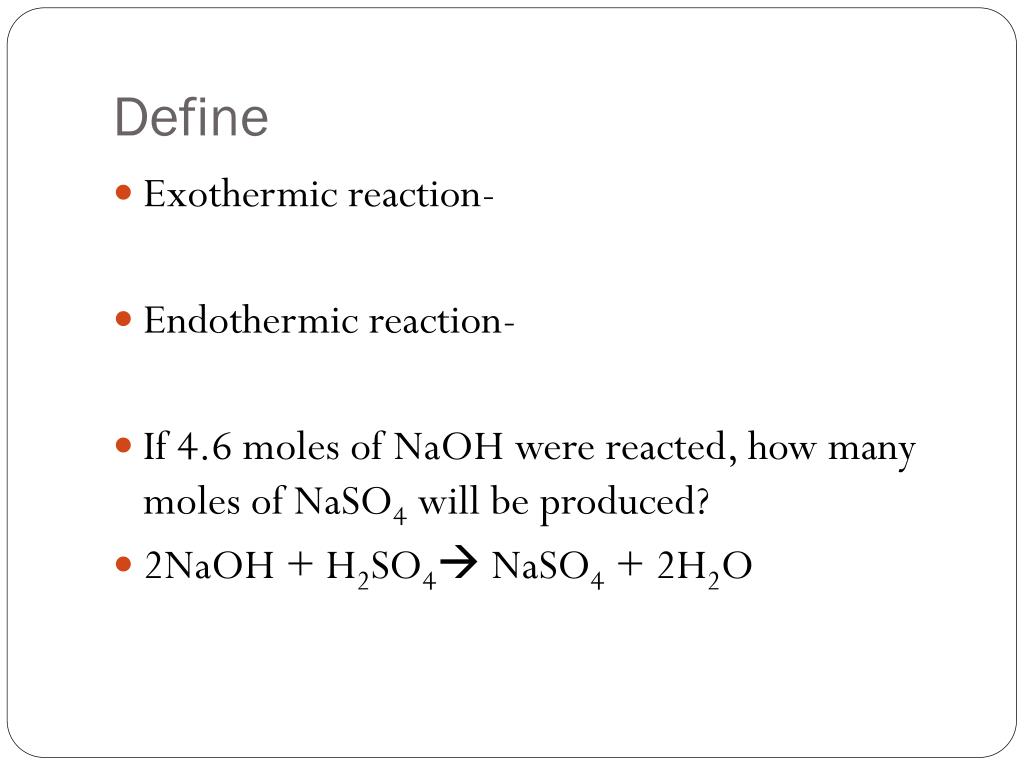 Define • Exothermic reaction- • Endothermic reaction- • If 4.6 moles of NaOHwere reacted, how many moles of NaSO4 will be produced? • 2NaOH + H2SO4 NaSO4 + 2H2O
