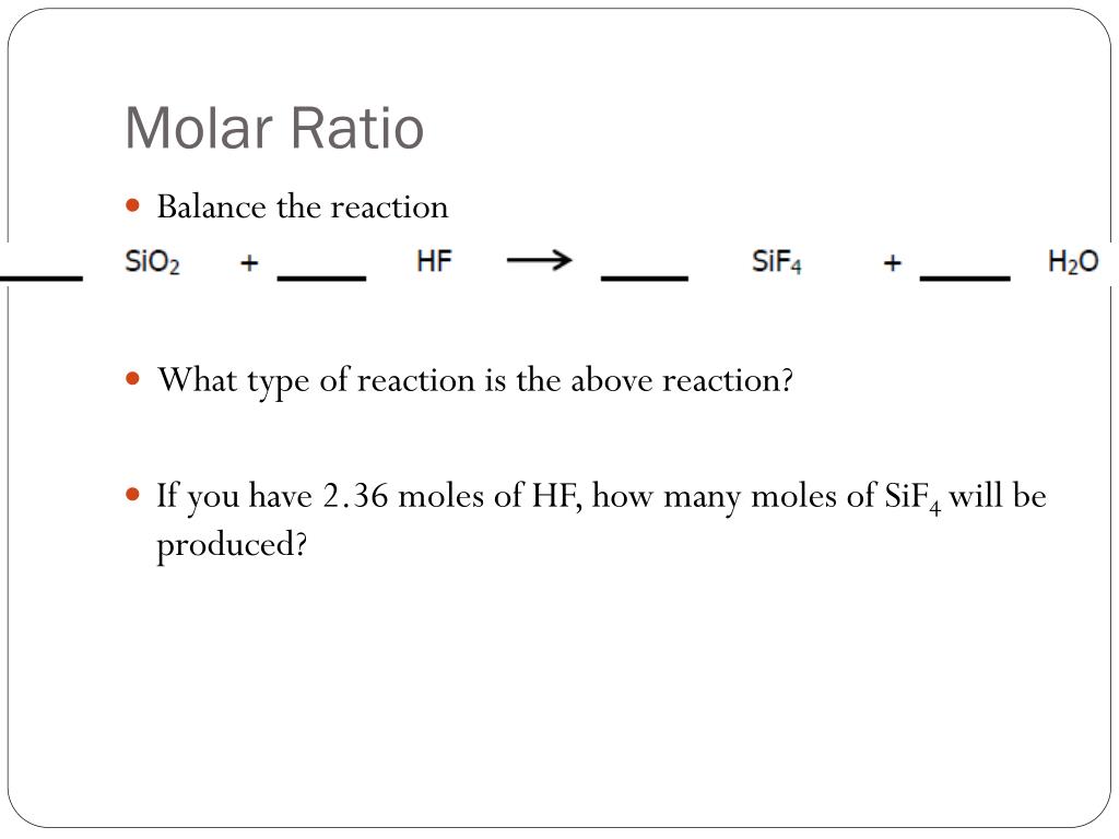 Molar Ratio • Balance the reaction • What type of reaction is the above reaction? • If you have 2.36 moles of HF, how many moles of SiF4 will be produced?