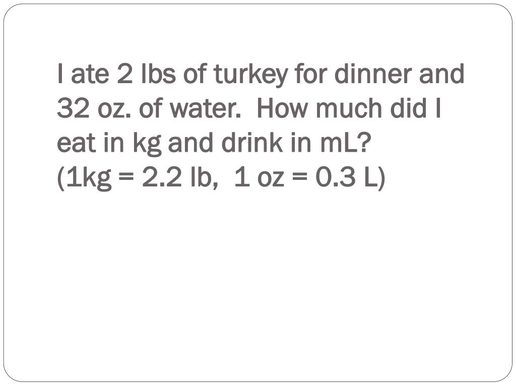 I ate 2 lbs of turkey for dinner and 32 oz. of water. How much did I eat in kg and drink in mL? (1kg = 2.2 lb, 1 oz = 0.3 L)
