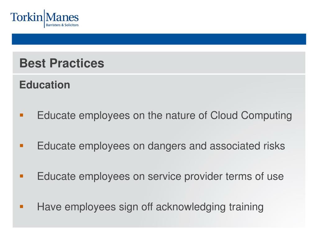 Best Practices Effective Contracts and Policies • Contracts should: • Include confidentiality provisions prohibiting disclosure or use of specified information • Include reference to relevant policies governing communications, BYOD, use of internet and social media in the workplace, protection of personal privacy, personal and health information • Specify that breach can result in termination for cause • Identify and clearly articulate issues (assignment?) of “property” in Cloud-based applications or information