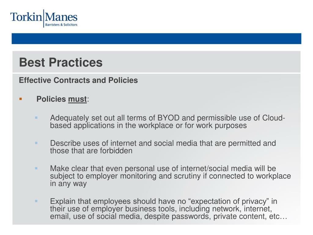 Best Practices Effective Contracts and Policies • Policies must: • Explain that communications at work may be monitored at any time • State that breaches will be subject to discipline up to and including termination for cause • Require employees to sign as having “received, read and understood” • Be consistently enforced
