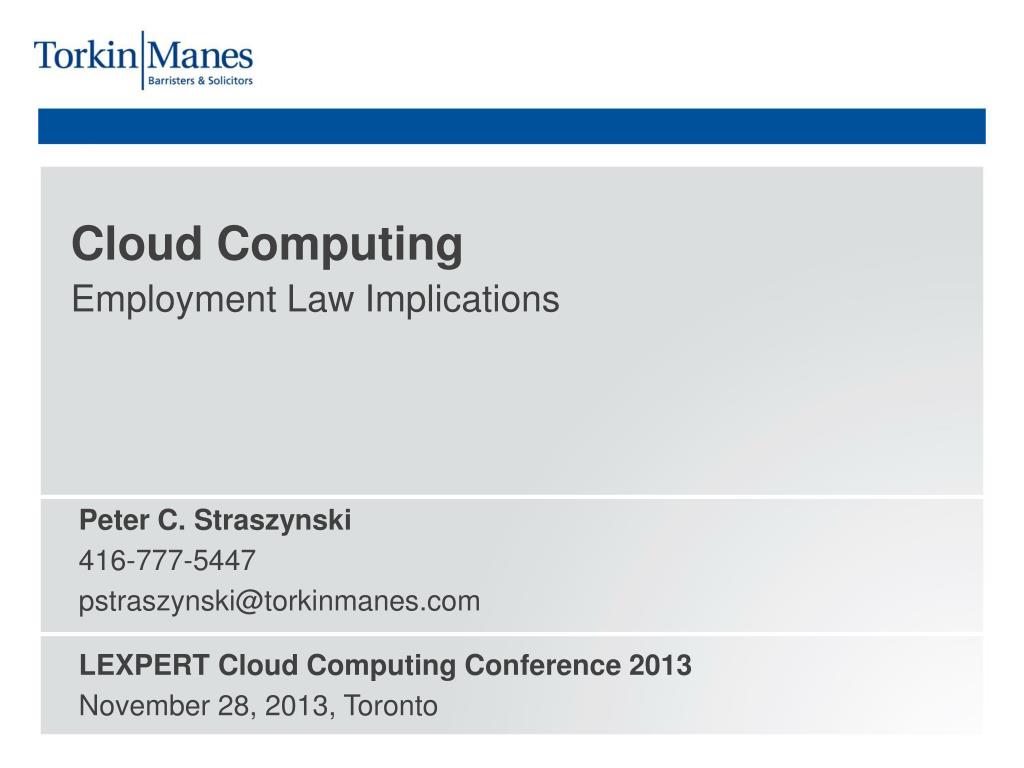 Employment Law Implications Cloud Computing Peter C. Straszynski 416-777-5447 pstraszynski@torkinmanes.com LEXPERT Cloud Computing Conference 2013 November 28, 2013, Toronto