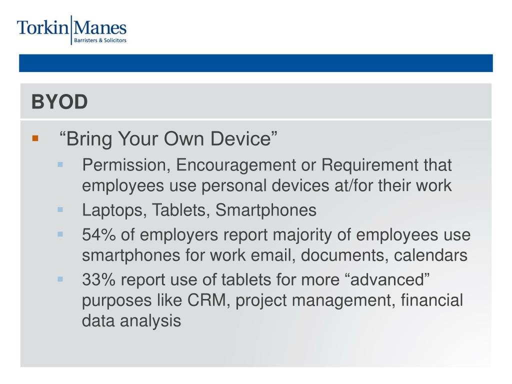 BYOD • “Bring Your Own Device” • Permission, Encouragement or Requirement that employees use personal devices at/for their work • Laptops, Tablets, Smartphones • 54% of employers report majority of employees use smartphones for work email, documents, calendars • 33% report use of tablets for more “advanced” purposes like CRM, project management, financial data analysis