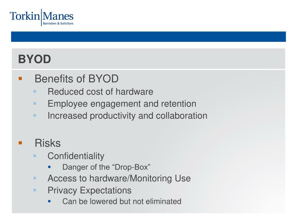 BYOD • Benefits of BYOD • Reduced cost of hardware • Employee engagement and retention • Increased productivity and collaboration • Risks • Confidentiality • Danger of the “Drop-Box” • Access to hardware/Monitoring Use • Privacy Expectations • Can be lowered but not eliminated