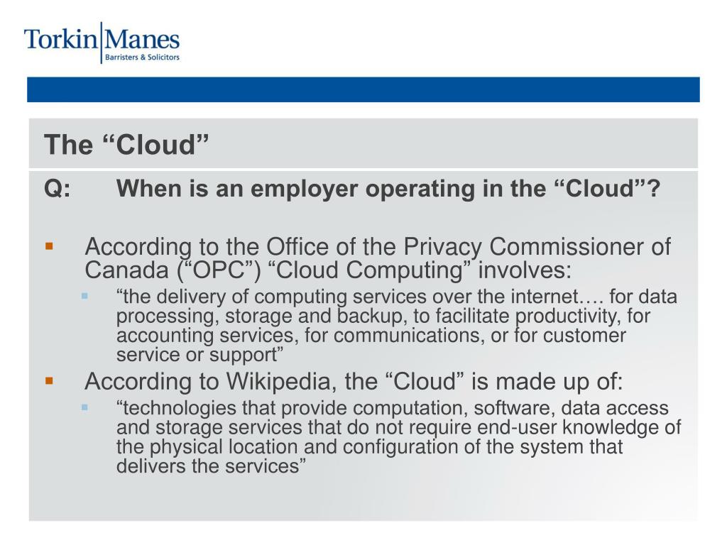 The “Cloud” Q: When is an employer operating in the “Cloud”? • According to the Office of the Privacy Commissioner of Canada (“OPC”) “Cloud Computing” involves: • “the delivery of computing services over the internet…. for data processing, storage and backup, to facilitate productivity, for accounting services, for communications, or for customer service or support” • According to Wikipedia, the “Cloud” is made up of: • “technologies that provide computation, software, data access and storage services that do not require end-user knowledge of the physical location and configuration of the system that delivers the services”