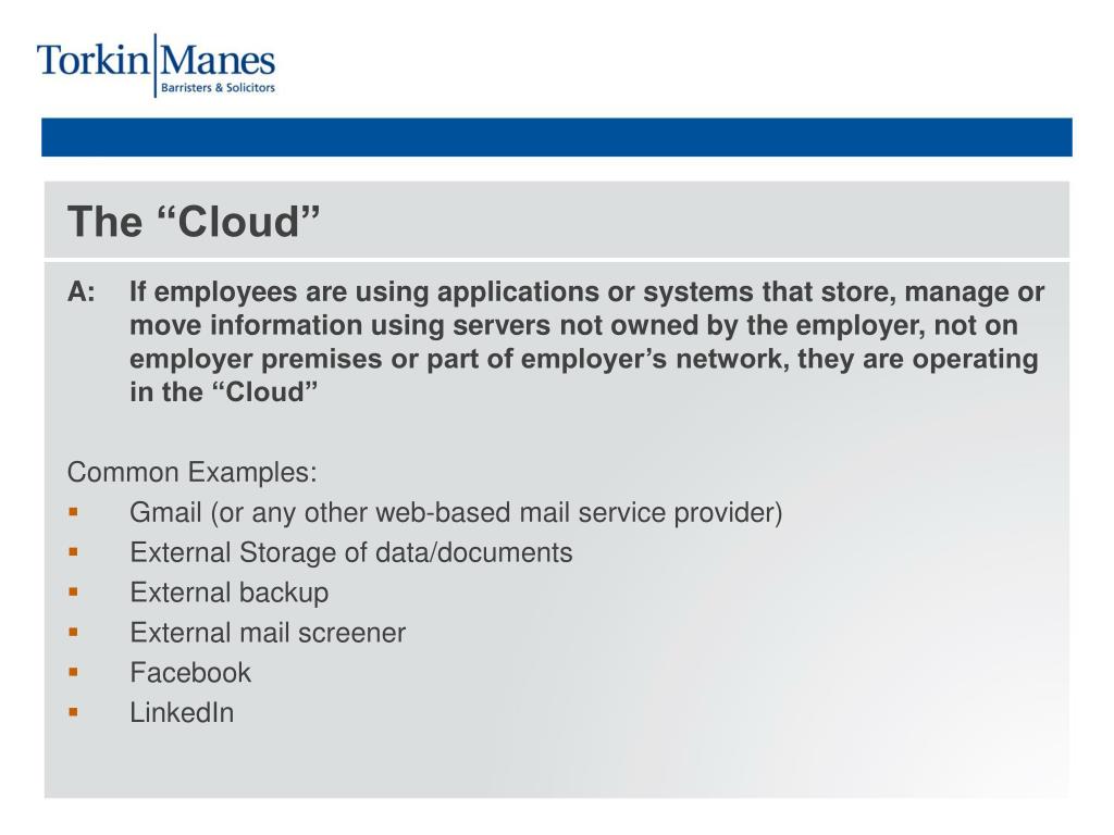The “Cloud” A: If employees are using applications or systems that store, manage or move information using servers not owned by the employer, not on employer premises or part of employer’s network, they are operating in the “Cloud” Common Examples: • Gmail (or any other web-based mail service provider) • External Storage of data/documents • External backup • External mail screener • Facebook • LinkedIn