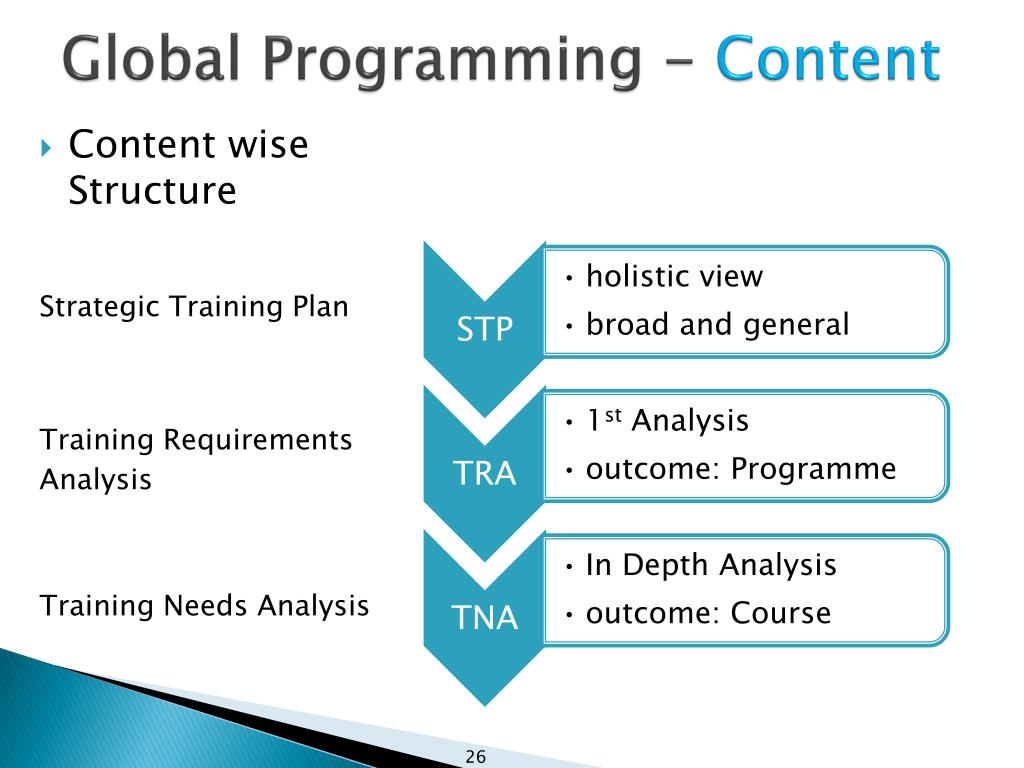 Global Programming - Content • Content wiseStructure Strategic Training Plan Training Requirements Analysis Training Needs Analysis