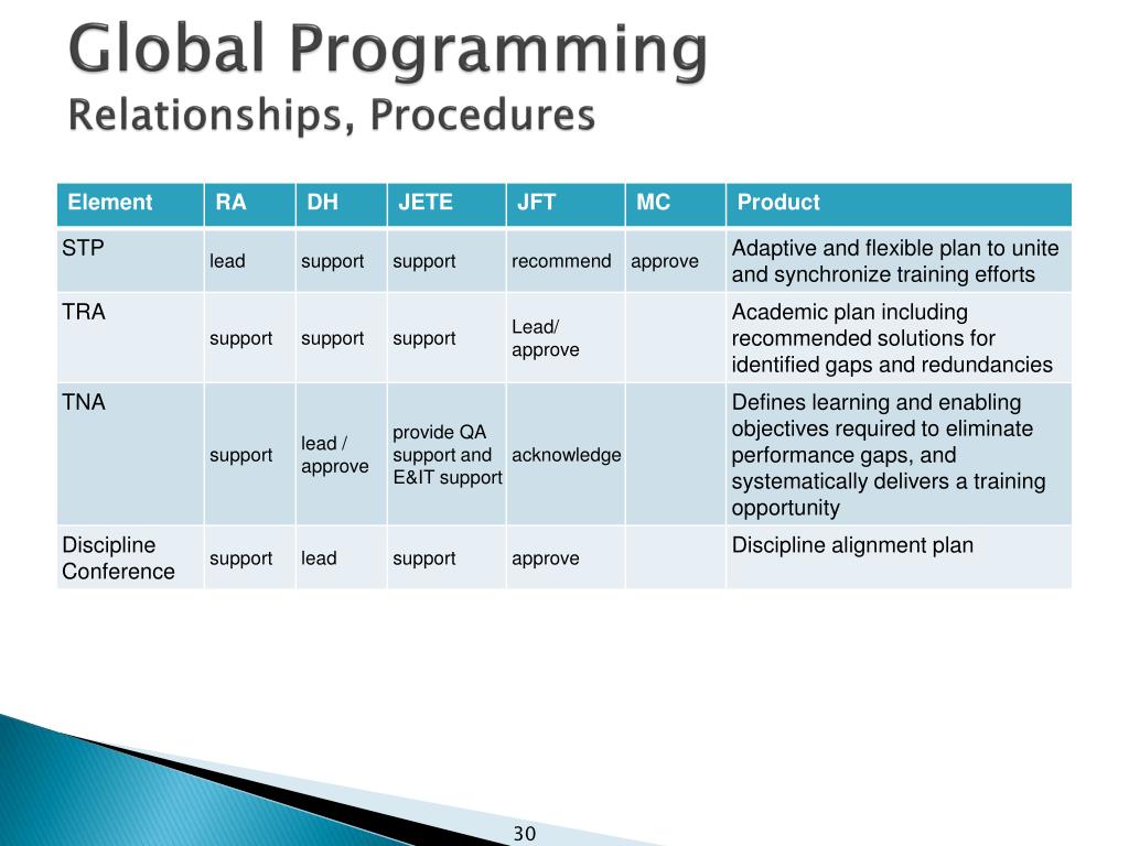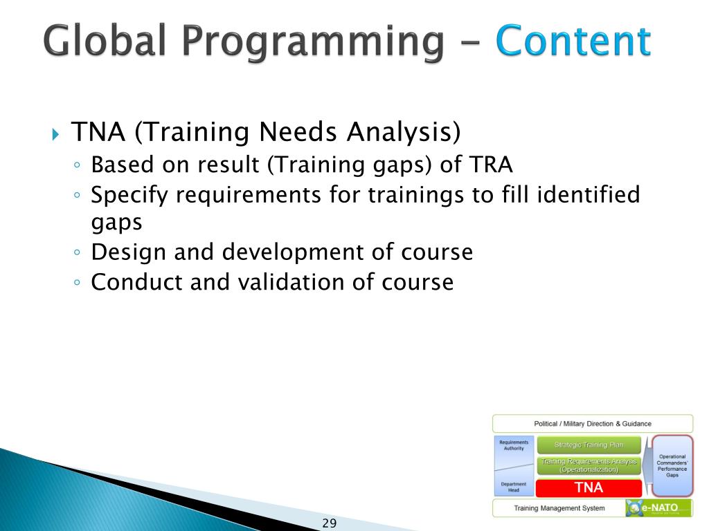 Global Programming - Content • TNA (Training Needs Analysis) • Based on result (Training gaps) of TRA • Specify requirements for trainings to fill identified gaps • Design and development of course • Conduct and validation of course TNA