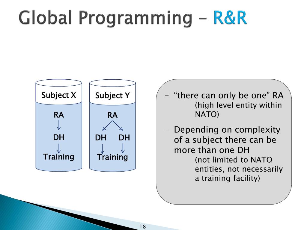 Global Programming – R&R RA DH Training RA DH DH Training • “there can only be one” RA • (high level entity within NATO) • Depending on complexity of a subject there can be more than one DH • (not limited to NATO entities, not necessarily a training facility) Subject X Subject Y