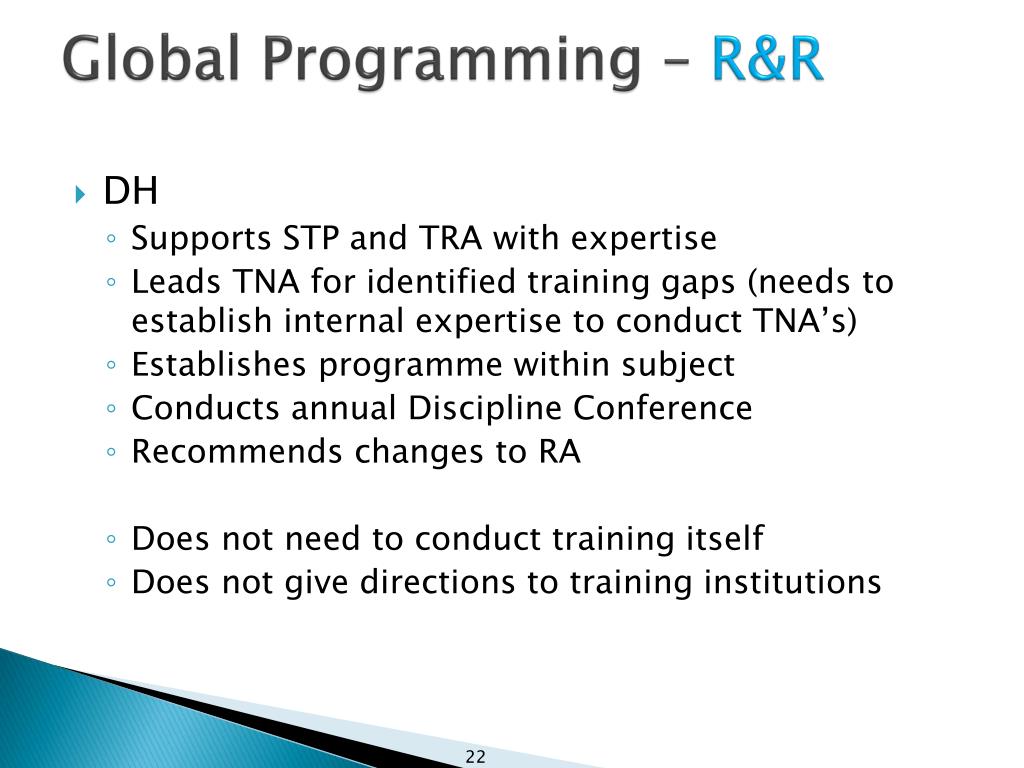 Global Programming – R&R • DH • Supports STP and TRA with expertise • Leads TNA for identified training gaps (needs to establish internal expertise to conduct TNA’s) • Establishes programme within subject • Conducts annual Discipline Conference • Recommends changes to RA • Does not need to conduct training itself • Does not give directions to training institutions