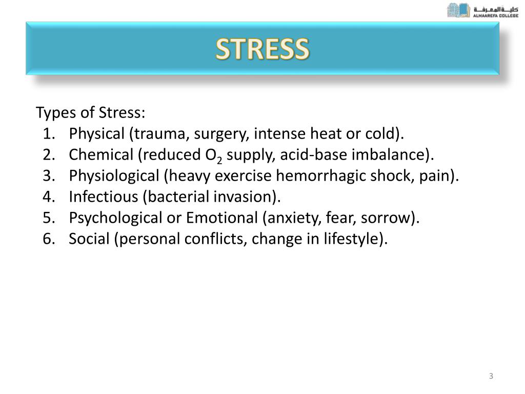 STRESS • Types of Stress: • Physical (trauma, surgery, intense heat or cold). • Chemical (reduced O2 supply, acid-base imbalance). • Physiological (heavy exercise hemorrhagic shock, pain). • Infectious (bacterial invasion). • Psychological or Emotional (anxiety, fear, sorrow). • Social (personal conflicts, change in lifestyle).