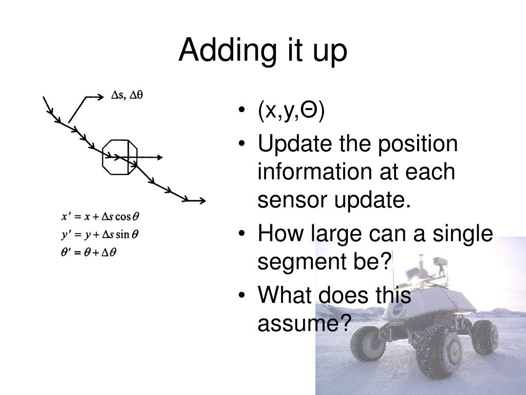 Adding it up • (x,y,Θ) • Update the position information at each sensor update. • How large can a single segment be? • What does this assume?