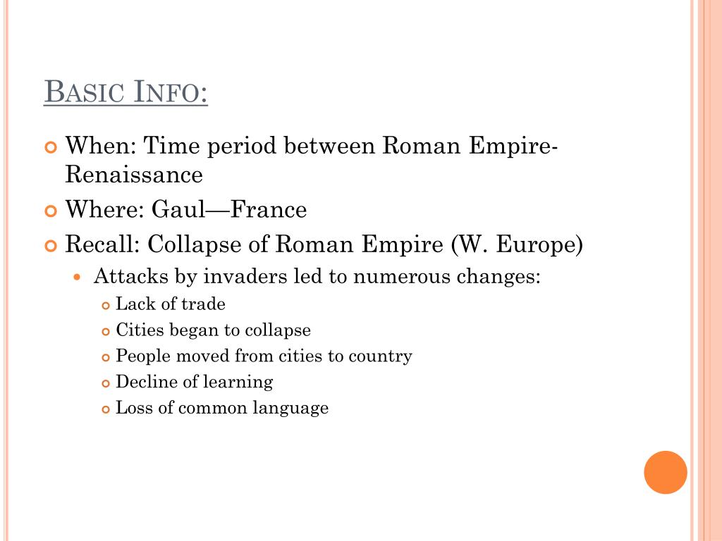 Basic Info: • When: Time period between Roman Empire- Renaissance • Where: Gaul—France • Recall: Collapse of Roman Empire (W. Europe) • Attacks by invaders led to numerous changes: • Lack of trade • Cities began to collapse • People moved from cities to country • Decline of learning • Loss of common language